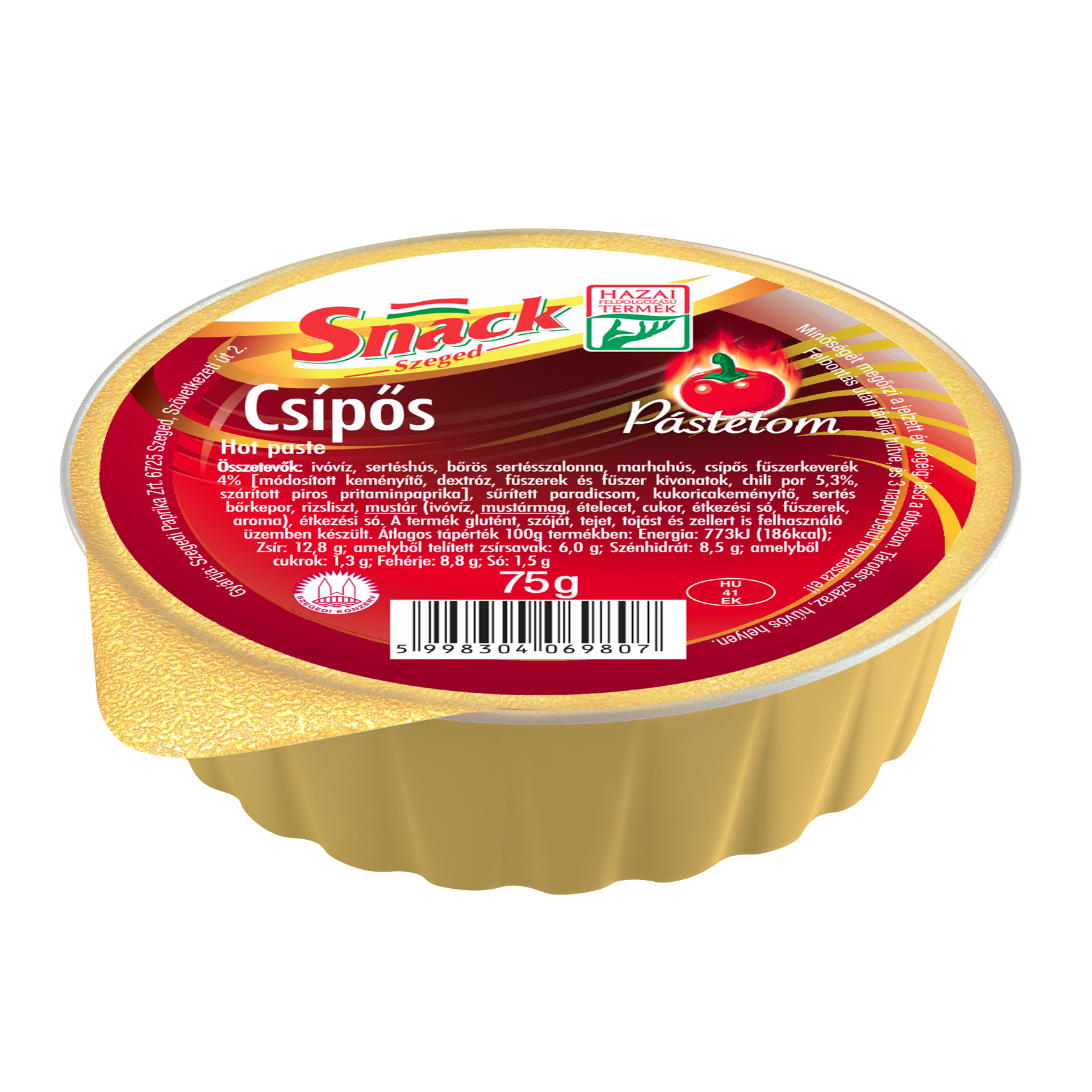 ivóvíz, sertéshús, bőrös sertésszalonna, marhahús, csípős fűszerkeverék 4% [módosított keményítő, dextróz, fűszerek és fűszer kivonatok, chili por 5,3%, szárított piros pritaminpaprika], sűrített paradicsom, kukoricakeményítő, sertés bőrkepor, rizsliszt, mustár (ivóvíz, mustármag, ételecet, cukor, étkezési só, fűszerek, aroma), étkezési só.