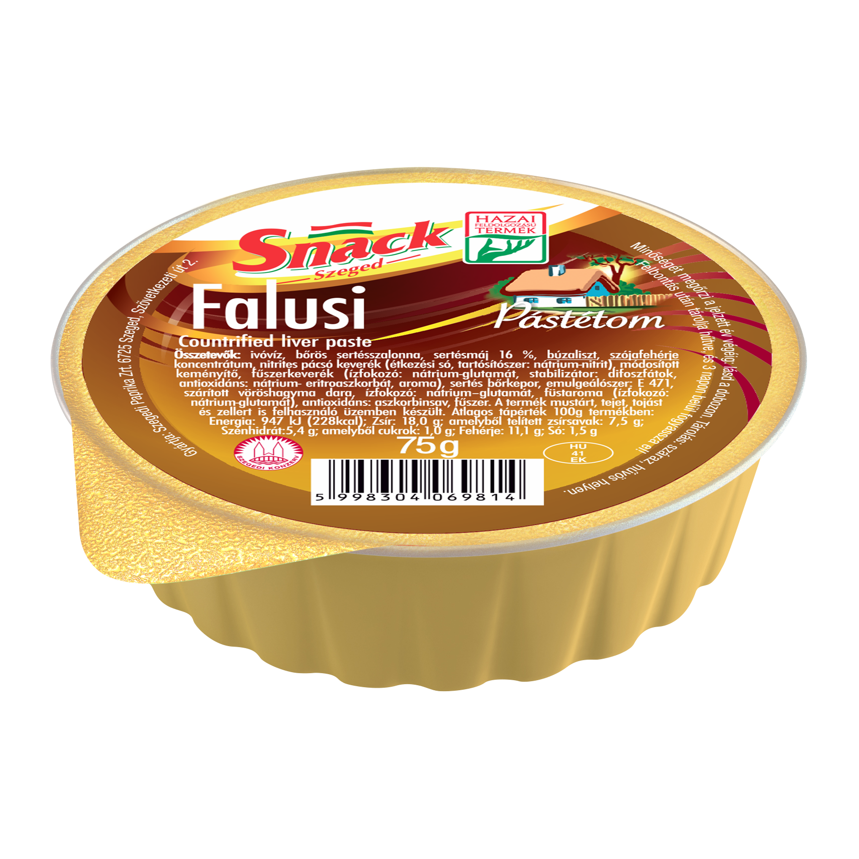 ivóvíz, bőrös sertésszalonna, sertésmáj 16 %, búzaliszt, szójafehérje koncentrátum, nitrites pácsó keverék (étkezési só, tartósítószer: nátrium-nitrit), módosított keményítő, fűszerkeverék (ízfokozó: nátrium-glutamát, stabilizátor: difoszfátok, antioxidáns: nátrium- eritroaszkorbát, aroma), sertés bőrkepor, emulgeálószer: E 471, szárított vöröshagyma dara, ízfokozó: nátrium–glutamát, füstaroma (ízfokozó: nátrium-glutamát), antioxidáns: aszkorbinsav, fűszer.
